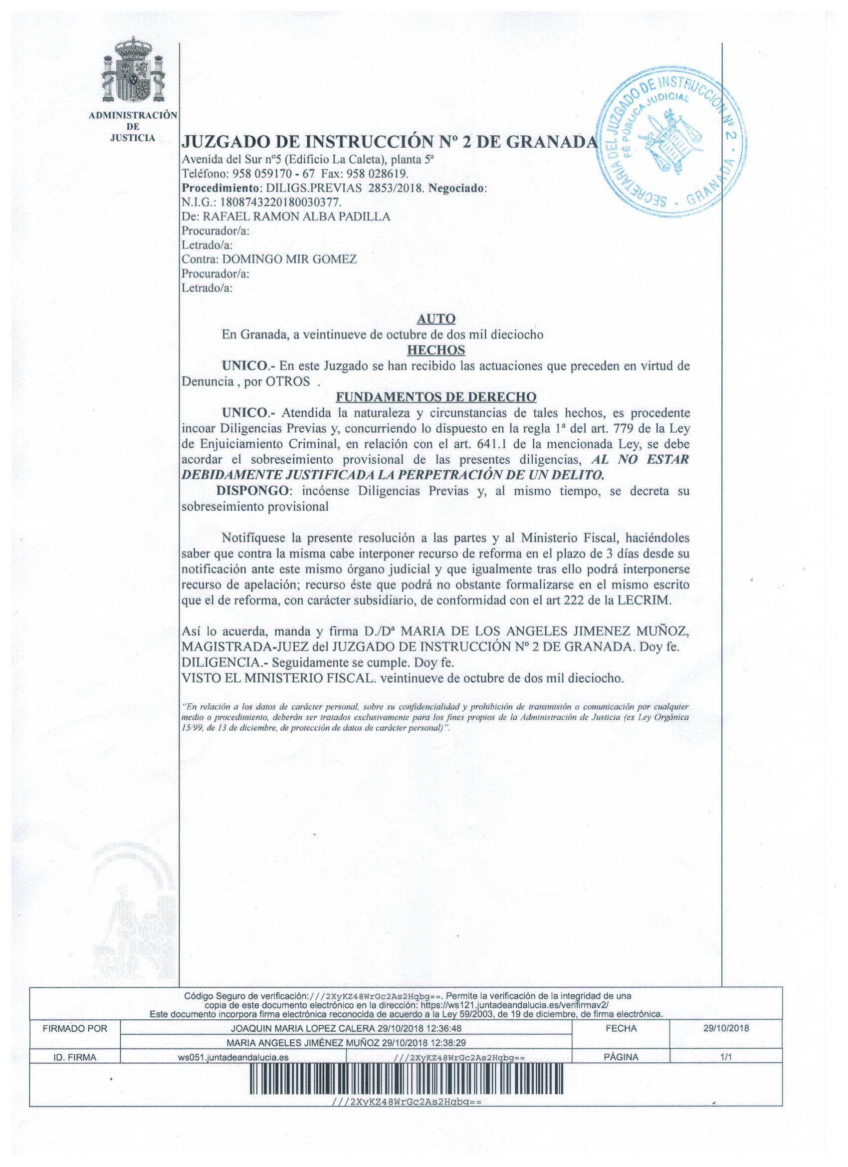 DENUNCIA 16-10-2018 Y PROVIDENCIA SP1 (SOBRESEIMIENTO PROVISIONAL) DE LA JUEZ 脕NGELES J脥M脡NEZ MU脩OZ DEL JUZGADO DE INSTRUCCI脫N N潞 2 DE GRANADA, DP 2853/2018