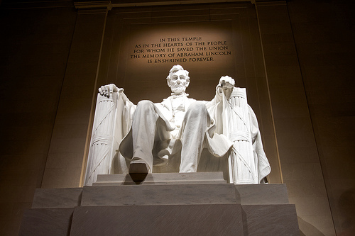 LINCOLN (2012) de Steven Spielberg  Spielberg realiza una espléndida puesta en escena y presentación del personaje de Lincoln en la película, sentado, escuchando en posición elevada los problemas que le cuentan los dos soldados que se acercan a hablar con él, tratando de imitar la imagen del famoso monumento a Lincoln que está grabada en la memoria de todos los americanos, pero las manos en vez de tenerlas sobre los brazos de un sillón (habría sido demasiado evidente), las tiene puestas sobre las rodillas, aunque con idéntica pose.